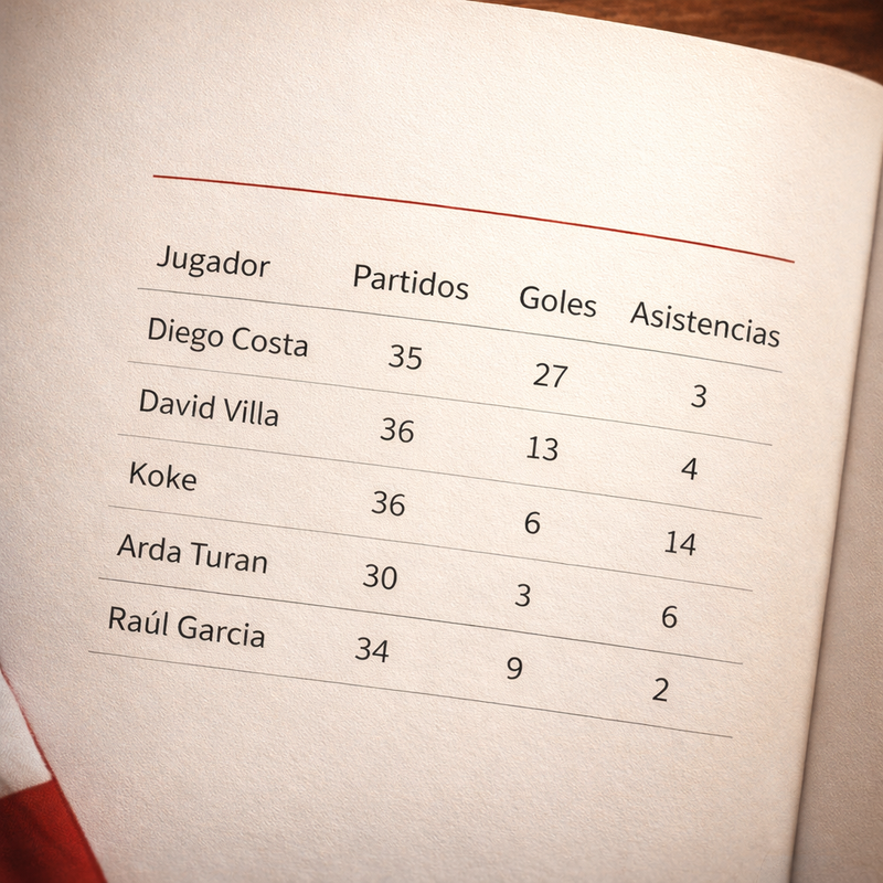 Courtois • Juanfran • Miranda • Godín • Filipe Luís • Tiago • Gabi • Koke • Arda Turan • Diego Costa • Villa • Raúl García • Adrián • Mario Suárez • Diego Ribas • Sosa • Alderweireld • Insúa • Óliver Torres • Cristian Rodríguez • Courtois • Juanfran • Miranda • Godín • Filipe Luís • Tiago • Gabi • Koke • Arda Turan • Diego Costa • Villa • Raúl García • Adrián • Mario Suárez • Diego Ribas • Sosa • Alderweireld • Insúa • Óliver Torres • Cristian Rodríguez •